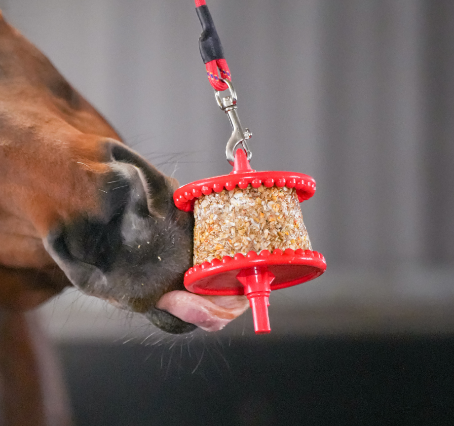 Red TT 2Secondly, the Tongue Twister, this product is designed to be fixed to a wall at wither height and is ideal for horses in smaller stables or for those that tend to ‘spook’ easily. Simply insert one or two Little Likits and as the horse uses the toy, the ball will spin making it harder for them to reach their reward. To increase the challenge insert just one Little Likit, gravity will pull the treat down. Studies have shown that environmental enrichment works best when animals are challenged with changes in their environment. Try regularly changing the flavour of the Little Likits and even more the location of the toy from time to time.